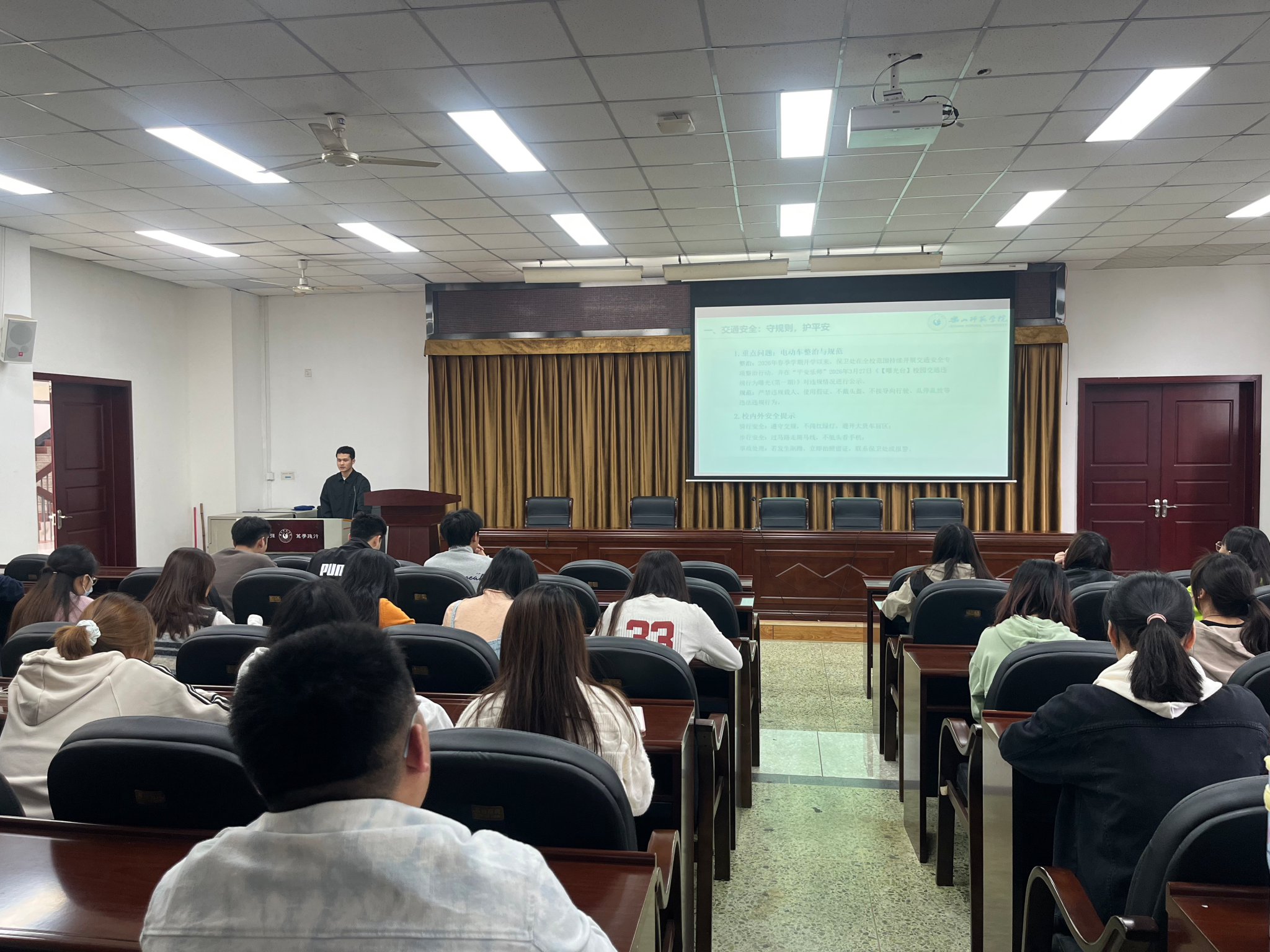 围绕这一主线,班会系统部署了五大安全教育领域。在交通安全方面,班会不仅强调遵守骑行规范对个人安全的重要性,更指出维护校园交通秩序是每位同学参与校园治理、共建平安共同体的责任担当,体现了“功成必定有我”的集体政绩观。针对电信网络诈骗,班会深入剖析骗局本质,强调筑牢思想防线、保持理性判断不仅是自我保护,更是培养堪当大任的时代新人必须具备的素养。