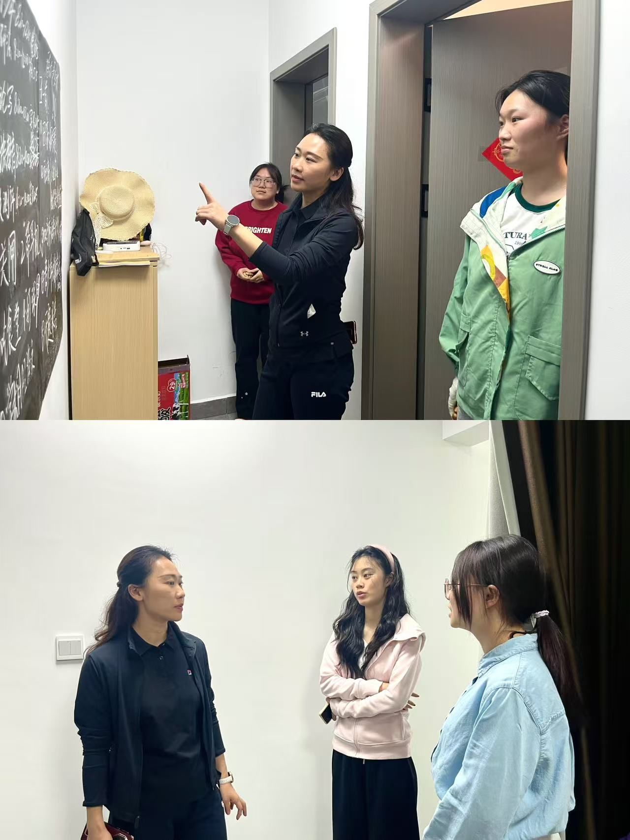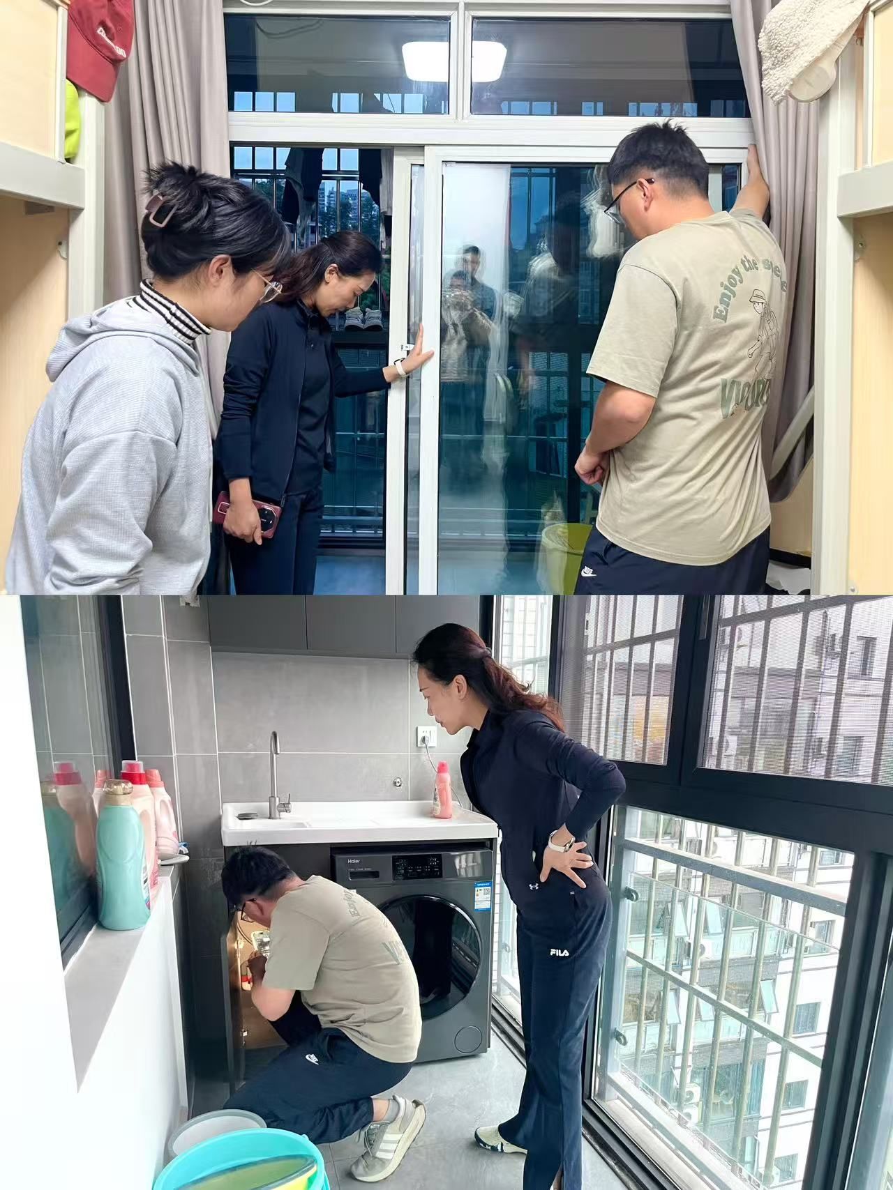走访过程中,王处长与同学们进行了亲切交流,悉心询问了大家的日常生活安排、学习科研进展以及是否存在实际困难。她叮嘱同学们要自觉保持宿舍的干净整洁,养成良好的卫生习惯,共同营造舒适的居住环境。在安全方面,王处长现场询问了同学们对灭火器正确使用方法的掌握情况,强调要时刻绷紧安全这根弦,切实提升应急自救能力。此外,王处长还逐一关心了宿舍设施设备的运行状况,详细了解是否存在损坏或需要报修的问题。针对同学们反映的水压过高、洗衣机漏水、家具松动等诉求,她当即记录并表示将第一时间协调相关部门跟进处理,全力保障同学们的正常学习生活。