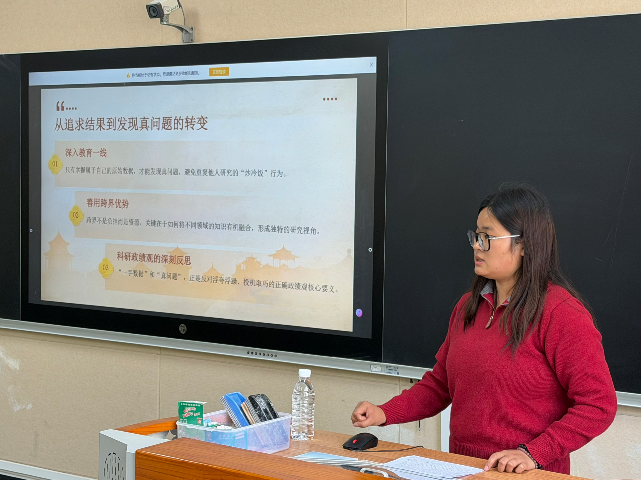蔡燕同志围绕《跨界·扎根 做实学问》主题,结合自身从网络与新媒体专业跨考至学科教学(语文)的经历,讲述了自己摒弃浮躁心态、深入一线调研、深耕“跨媒介阅读与交流”任务群研究的成长历程,彰显了青年党员脚踏实地、求真务实的治学态度,诠释了“扎根实践出真绩”的学术追求。